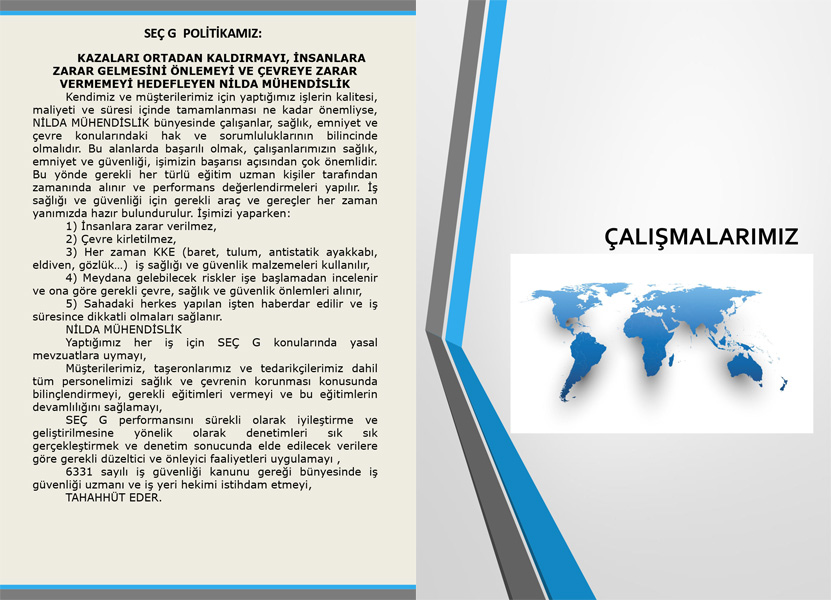 Firmamızda uygulanmakta olan tüm süreçlerin, uluslararası kalite düzeyinde gerçekleştirilmesi ve çalışanların katılımı ile sürekli iyileştirilmesi, faaliyetlerimiz sırasında çevrenin korunması, kurmuş olduğumuz tesislerde müşterilerimizin ekonomik ve teknik gereksinimlerine en uygun bir şekilde gerçekleştirilmesi, vazgeçilmez prensiplerimiz arasındadır.